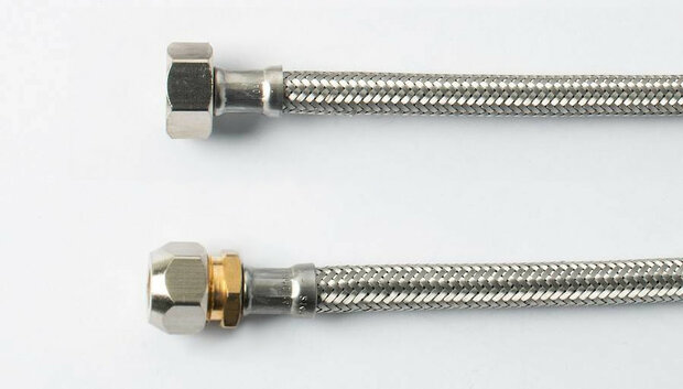 Flexibele Waterslang DN8 1/2'' bi x 15 mm knel | Ø 8 mm Flexibele aansluitslang met rvs omvlechting en Kiwa-keur. Toepassingsgebied: Aansluiting van sanitaire kranen of andere sanitaire producten met een doorstroom hoeveelheid van maximaal 28 l/min (3 bar). Eigenschappen: - geschikt voor drinkwater - binnendiameter: Ø 8 mm - buitendiameter: Ø 12 mm - binnendiameter fittingen: 6 mm - nominale flow: 28 l/min (3 bar) - max. bedrijfstemperatuur: +110°C - max. bedrijfsdruk: 10 bar - max. piekdruk: 22 bar - max. toegestane buigradius: > 30 mm - garantie: 5 jaar - KIWA certificaat nr.: K6285/08 Materialen: - slang: EPDM - koppelingen: messing, vernikkeld - omvlechting: rvs (AISI 304) - pershulsen: rvs (AISI 304) 11820610300-1512 11820610500-1512 Andere afmetingen / uitvoeringen op aanvraag.