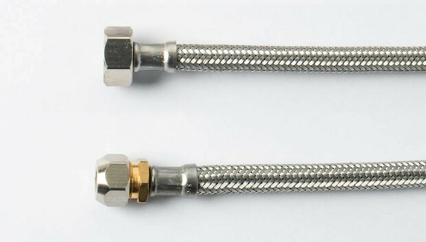Flexibele Waterslang DN8 1/2'' bi x 12 mm knel | Ø 8 mm / met rvs omvlechting en Kiwa-keur. Flexibele aansluitslang met rvs omvlechting en Kiwa-keur. Toepassingsgebied: Aansluiting van sanitaire kranen of andere sanitaire producten met een doorstroom hoeveelheid van maximaal 28 l/min (3 bar). Eigenschappen: - geschikt voor drinkwater - binnendiameter: Ø 8 mm - buitendiameter: Ø 12 mm - binnendiameter fittingen: 6 mm - nominale flow: 28 l/min (3 bar) - max. bedrijfstemperatuur: +110°C - max. bedrijfsdruk: 10 bar - max. piekdruk: 22 bar - max. toegestane buigradius: > 30 mm - garantie: 5 jaar Materialen: - slang: EPDM - koppelingen: messing, vernikkeld - omvlechting: rvs (AISI 304) - pershulsen: rvs (AISI 304) 11820600300-1212 11820600500-1212 Andere afmetingen / uitvoeringen op aanvraag.