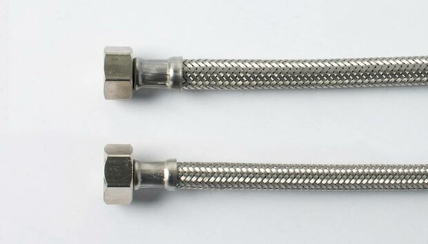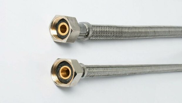 Flexibele Waterslang DN8 G3/8 Bi - G1/2 Bi Flexibele aansluitslang met rvs omvlechting en Kiwa-keur. Toepassingsgebied: Aansluiting van sanitaire, verwarmings- en koelinstallaties met een doorstroom hoeveelheid van maximaal 65 l/min (3 bar). Materialen: - slang: EPDM - koppelingen: messing, vernikkeld - omvlechting: rvs (AISI 304) - pershulsen: rvs (AISI 304) Eigenschappen: - geschikt voor drinkwater - nominale flow: 65 l/min (3 bar) - max. bedrijfstemperatuur: +110°C - max. bedrijfsdruk: 10 bar - max. piekdruk: 18 bar - max. toegestane buigradius: > 45 mm - garantie: 5 jaar 11820430300-3812 11820430500-3812