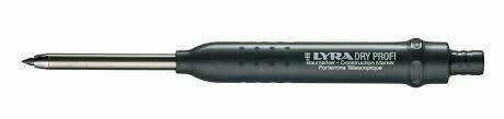 De vernieuwde en verbeterde bouwmarker van LYRA. Het LYRA Dry PROFI aftekenpotlood werkt op basis van een drukmecahnisme. In tegenstelling tot het al bestaande LYRA Dry aftekenpotlood wat met een schuifsysteem werkt.