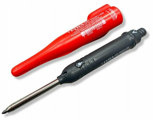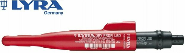 De vernieuwde en verbeterde bouwmarker van LYRA. Het LYRA Dry PROFI aftekenpotlood werkt op basis van een drukmecahnisme. In tegenstelling tot het al bestaande LYRA Dry aftekenpotlood wat met een schuifsysteem werkt.