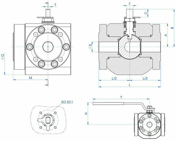 MAGNUM Split Wafer 3 ways 4 seals,3 weg, carbon steel, A105 Ball Valve-,hand bediend, - L - ,L Port,G1 1/4 - DN32 / pn 16-40,16,