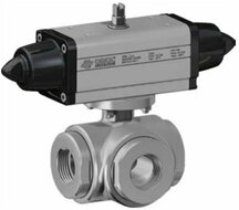 Drieweg RVS kogelkraan (T-boring) met enkelwerkende pneumatische aandrijving (SR). Makkelijk schoon te maken door gepolijste buitenkant. Leverbaar: 3/8''- 4''.