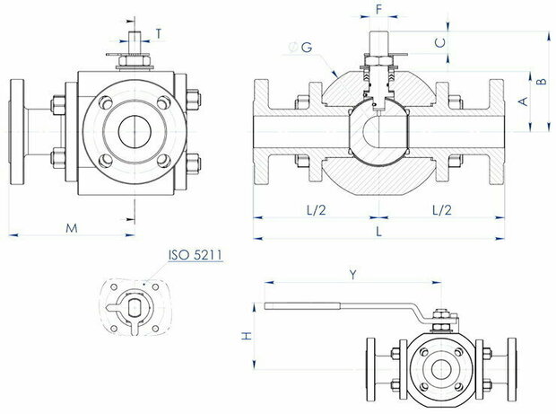 Thor Split Body 3 ways 4 seals,3 weg, carbon steel, A105 Ball Valve-,free shaft, - L - ,L Port,G2 - DN50 / pn 16-40,16,