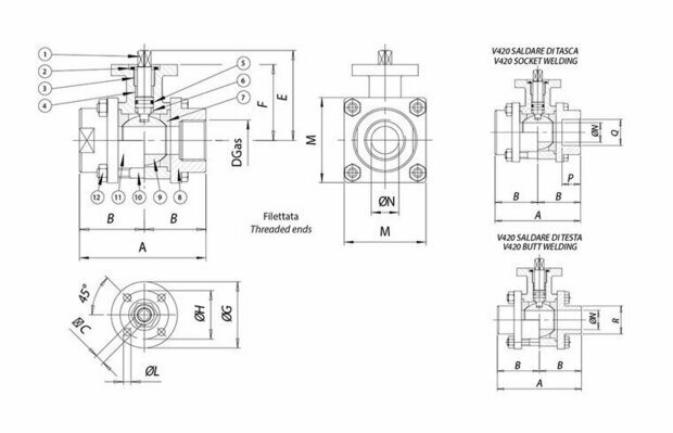 V420 ,rvs , Ball Valve-,hand bediend,with threaded valve,bspp, - G1/2 - DN15 ,63,Bar/ pn 63,