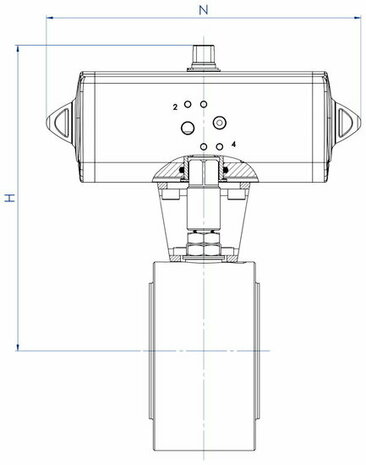 Pneumatisch aangedreven (DA)Dubbelwerkende actuator — sluit perslucht aan van 4–8 bar op beide poorten. Open/close bediening via elektrovent of handbedieningspaneel.